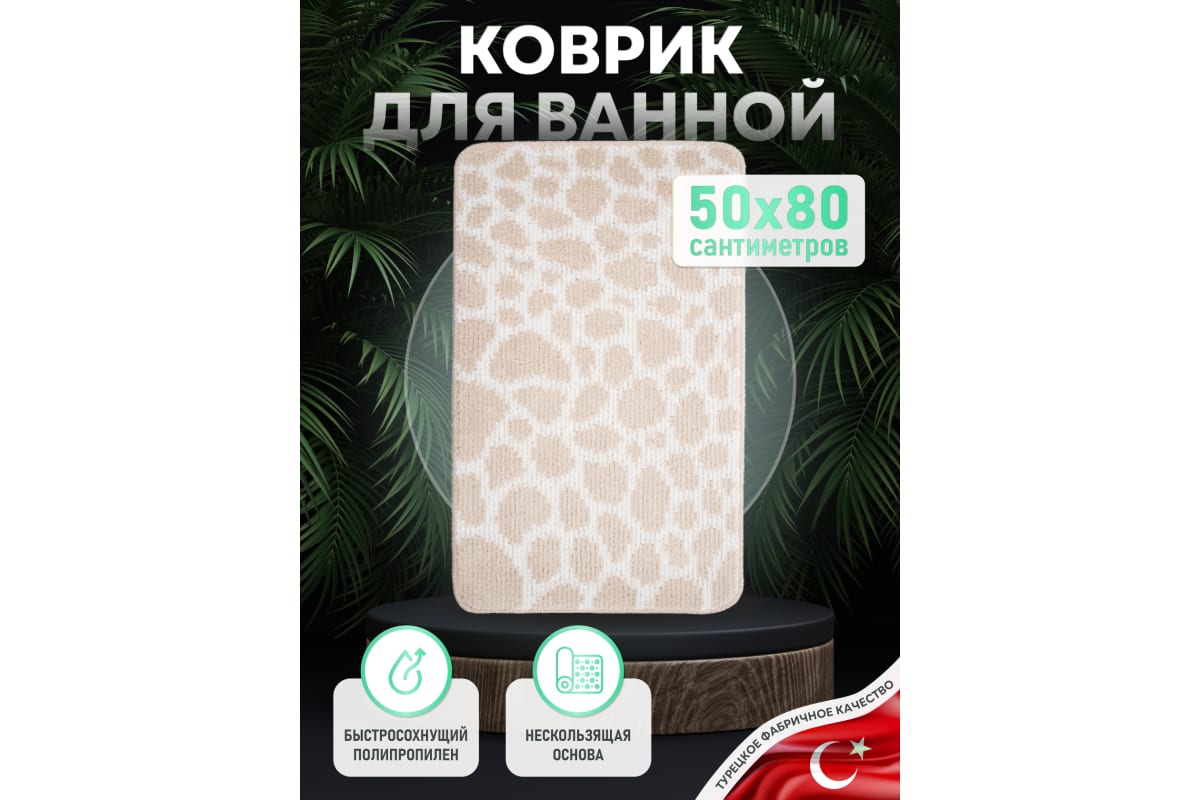 Материал: Полипропилен Цвет: Бежевый Производитель: Турция ДxШxВ: 800x500x40 мм Прочный влагостойкий коврик 50×80 см, нескользящая основа, легко чистится, современный бежевый дизайн, идеален для ванной и санузла.