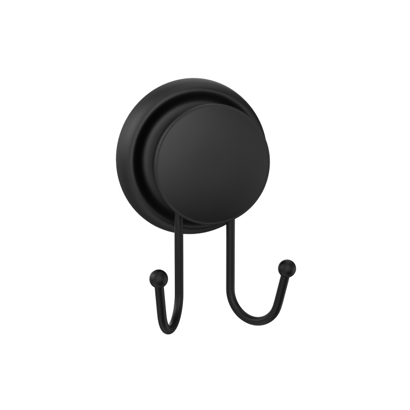Тип крепления: Вакуумные присоски Максимальная нагрузка: 10 кг Материал: Нержавеющая сталь, полимер Цвет: Черный ДxШxВ: 50x72x107 мм Двойной крючок из прочного металла, черное покрытие, устойчив к влаге и царапинам, современный дизайн для ванной или прихожей.