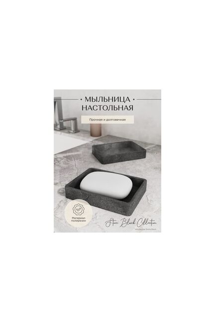 ДxШxВ: 90x123x23 мм Материал корпуса: полирезин Поверхность: матовая Цвет корпуса: черный Настольная мыльница из полирезина: прочная, устойчивая, с современной текстурой камня и влагостойким покрытием — идеально в любой интерьер.