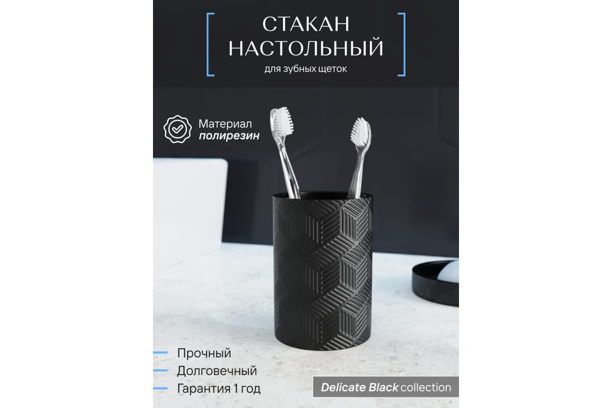 ДxШxВ: 74x74x110 мм Материал корпуса: полирезин Поверхность: матовая Цвет корпуса: черный Компактный, влагостойкий и прочный черный стакан из полирезина подчеркнет стиль ванной и надежно хранит до 4 зубных щеток.