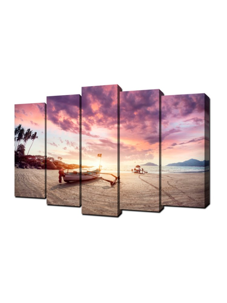 Добавьте в интерьер яркие акценты и атмосферу уюта с помощью впечатляющей 5-модульной картины (125×80 см), идеально подходящей для украшения гостиной, спальни, офиса или зоны отдыха. Панно легко вписывается в современные и классические стили, преображает пространство и создает уникальное настроение благодаря выразительному изображению заката.