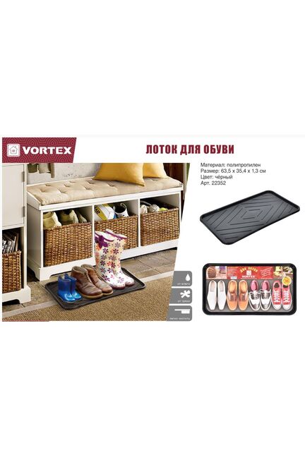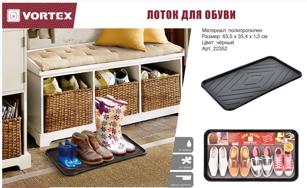 Практичное и эстетичное решение для прихожей. Подходит для хранения любого типа обуви, позволяет эффективно использовать пространство. Специальная рельефная поверхность способствует стеканию воды или грязи, сохраняя чистоту в доме. Прочный коврик-лоток защитит пол от грязи и воды, подходит для 2–4 пар обуви, не скользит, легко очищается и устойчив к влаге и химикатам.
