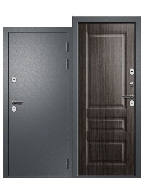 Производитель: Ретвизан. Внешнее покрытие: трехслойное полимерное покрытие «Букле черный». Внутреннее покрытие: фрезерованная влагостойкая с рисунком МДФ 16 мм. Толщина дверного полотна: 110 мм. Глубина дверного короба: 145 мм. Толщина металла: 1,4 мм. Терморазрыв: терморазрыв на коробе и полотне. Внутреннее наполнение: экструдированный пенополистирол. Уплотнитель: 3 контура, специализированный дверной уплотнитель. Замки: 2шт, BORDER сувальдный. Ночная задвижка: есть. Эксентрик: есть, для регулировки прижима полотна. На основном замке металлический эксцентрик для защелки, пластиковый - для ригеля замка. Ручка: раздельная, цвет - хром. Накладки: овальные с защитой от сквозняков. Глазок: есть. Противосъем: штыри, 3шт. Петли: 3шт., наружные, осевые, открывание 180°.