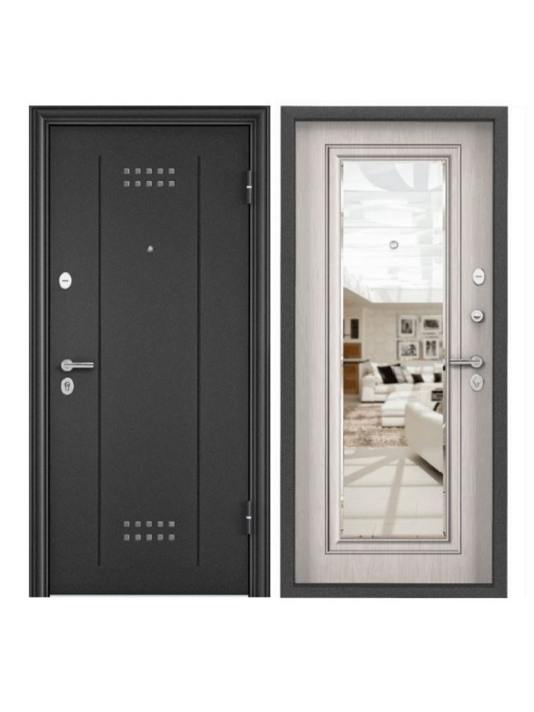 Прочная металлическая дверь с стильным покрытием тёмно-серый букле графит и внутренней отделкой лиственница белая — надёжное решение для квартиры, дома или офиса, сочетающее безопасность и современный дизайн.