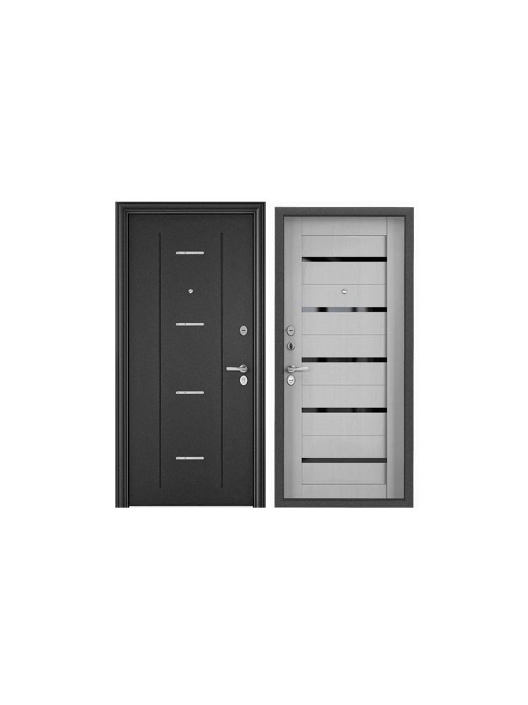 - Двусторонняя отделка: тёмно-серое порошковое покрытие «Букле графит» с наружной стороны и декоративная панель «Дуб белый матовый» внутри — гармония стиля, защита от повреждений и пыли.