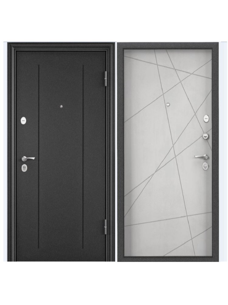 Надёжная металлическая дверь, идеально подходит для установки в квартиру или частный дом, обеспечит максимальную защиту и современный стиль. Снаружи — покрытие тёмно-серый букле графит RGSO, внутри — изысканный бетон известковый D6-26 с декоративным хромовым молдингом, что делает модель универсальным решением для разных интерьеров.