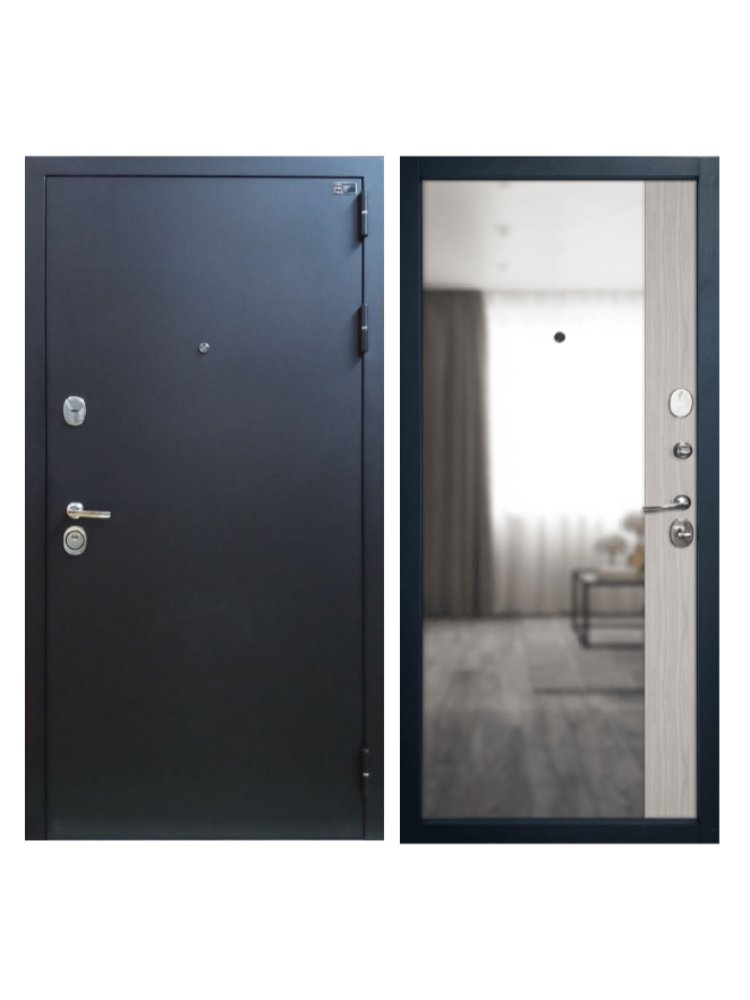 Стальная дверь для квартиры и частного дома — надежная защита и стиль в одном решении. Идеальна для входных групп, обеспечивает высокий уровень безопасности и долговечности. Современный дизайн: снаружи матовое покрытие букле черный, внутри — декоративная панель цвета Stone Oak и большое зеркало, что визуально расширяет пространство прихожей и добавляет свет.