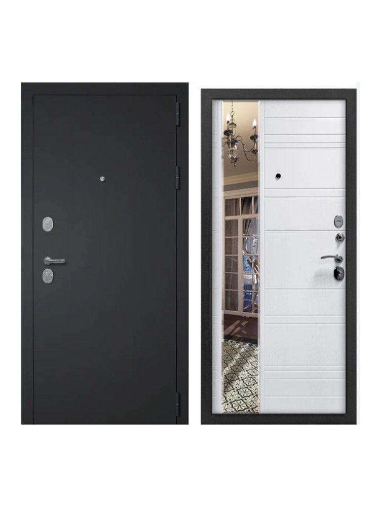 Элегантное и надежное решение для вашего дома и квартиры — эффектная металлическая дверь с изысканной фактурой «черный муар с блестками» и стильной белой внутренней панелью отлично впишется в современные интерьеры, а большое вертикальное зеркало зрительно расширяет пространство прихожей и делает повседневное использование максимально комфортным.