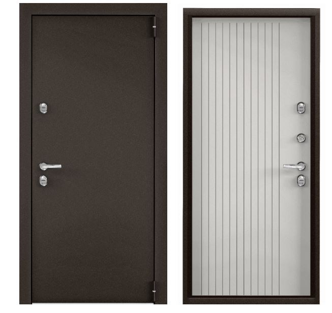 Тип внешней отделки: порошково-полимерное покрытие. Тип внутренней отделки: панель МДФ с ПВХ покрытием. Верхний замок: BORDER 3В 8-8Г/15, 4-го класса взломостойкости по ГОСТ 5089-2011. Нижний замок: Crit A30-4Л, 2-го класса вломостойкости по ГОСТ 5089-2011. Декоративные накладки на ключевину сувальдного замка с направляющими для ключа и подпружиненными шторками от продувания. Противосъемные ригели с петлевой стороны полотна 2 шт. Ночная задвижка.