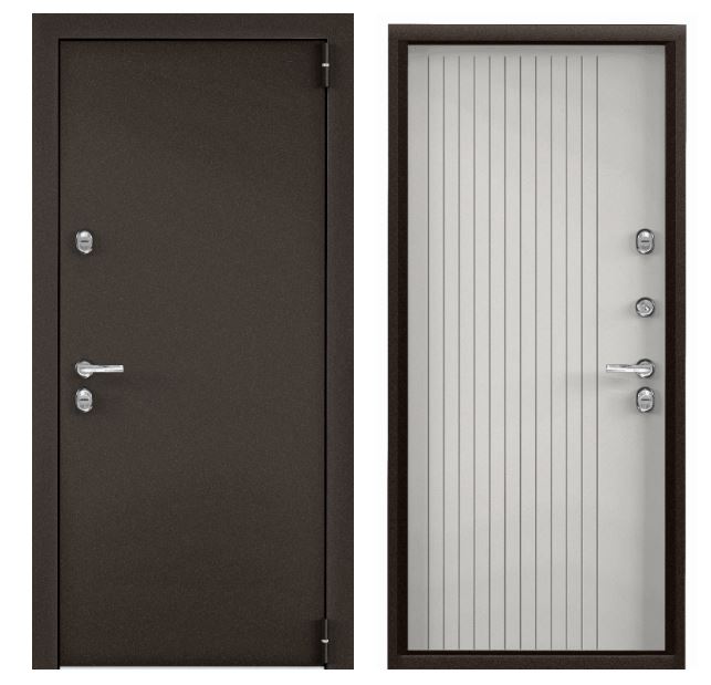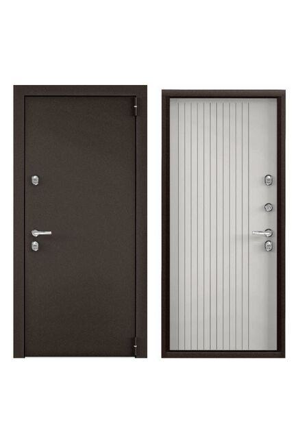 Тип внешней отделки: порошково-полимерное покрытие. Тип внутренней отделки: панель МДФ с ПВХ покрытием. Верхний замок: BORDER 3В 8-8Г/15, 4-го класса взломостойкости по ГОСТ 5089-2011. Нижний замок: Crit A30-4Л, 2-го класса вломостойкости по ГОСТ 5089-2011. Декоративные накладки на ключевину сувальдного замка с направляющими для ключа и подпружиненными шторками от продувания. Противосъемные ригели с петлевой стороны полотна 2 шт. Ночная задвижка.