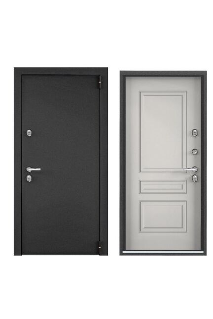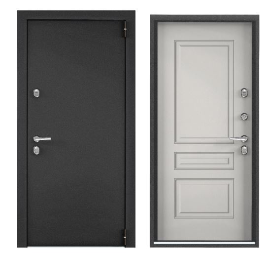 Тип внешней отделки: порошково-полимерное покрытие. Тип внутренней отделки: панель МДФ с ПВХ покрытием. Верхний замок: BORDER 3В 8-8Г/15, 4-го класса взломостойкости по ГОСТ 5089-2011. Нижний замок: Crit A30-4Л, 2-го класса вломостойкости по ГОСТ 5089-2011. Декоративные накладки на ключевину сувальдного замка с направляющими для ключа и подпружиненными шторками от продувания. Противосъемные ригели с петлевой стороны полотна 2 шт. Ночная задвижка.