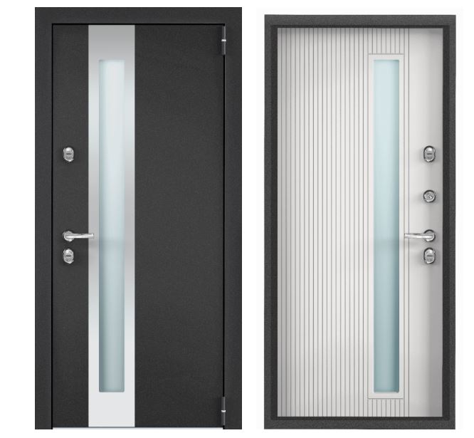 Тип внешней отделки: порошково-полимерное покрытие. Тип внутренней отделки: панель МДФ с ПВХ покрытием. Верхний замок: BORDER 3В 8-8Г/15, 4-го класса взломостойкости по ГОСТ 5089-2011. Нижний замок: Crit A30-4Л, 2-го класса вломостойкости по ГОСТ 5089-2011. Декоративные накладки на ключевину сувальдного замка с направляющими для ключа и подпружиненными шторками от продувания. Противосъемные ригели с петлевой стороны полотна 2 шт. Ночная задвижка. Металлическая утеплённая дверь 880х2050 мм с отделкой серое букле/белый, замками, тепло- и шумоизоляцией для дома и квартиры.