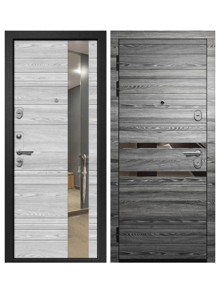 Внешняя отделка: Трехслойное полимерное покрытие + МДФ 10 мм(декор) Цвет: Вяз каньон вековой графит+молдинг (RAL7039) Внутренняя отделка: МДФ 10 мм с фрезерованным рисунком Цвет панели: Вяз каньон вековой айс и вставка «зеркало» Толщина стали:1,4 мм. Толщина полотна: 115 мм Толщина короба: 145 мм Наполнение: минеральна плита Уплотнение: тройной уплотнитель Размеры: 860*2050, 960*2050 Основной замок: BORDER 3B4-3/85Г (цилиндровый) Дополнительный замок: BORDER ЗВ 8-6/Б5Т (сувальдный) Ночная задвижка: есть Ручка раздельная, ключ вертушка, броненакладка, глазок, эксцентрик Надежная дверь с долговечной отделкой, отличной шумо- и теплоизоляцией, современным дизайном и максимальной защитой вашего дома.