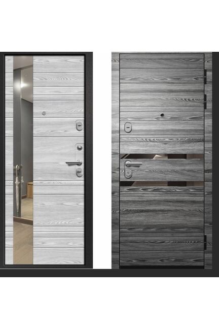 Внешняя отделка: Трехслойное полимерное покрытие + МДФ 10 мм(декор) Цвет: Вяз каньон вековой графит+молдинг (RAL7039) Внутренняя отделка: МДФ 10 мм с фрезерованным рисунком Цвет панели: Вяз каньон вековой айс и вставка «зеркало» Толщина стали:1,4 мм. Толщина полотна: 115 мм Толщина короба: 145 мм Наполнение: минеральна плита Уплотнение: тройной уплотнитель Размеры: 860*2050, 960*2050 Основной замок: BORDER 3B4-3/85Г (цилиндровый) Дополнительный замок: BORDER ЗВ 8-6/Б5Т (сувальдный) Ночная задвижка: есть Ручка раздельная, ключ вертушка, броненакладка, глазок, эксцентрик