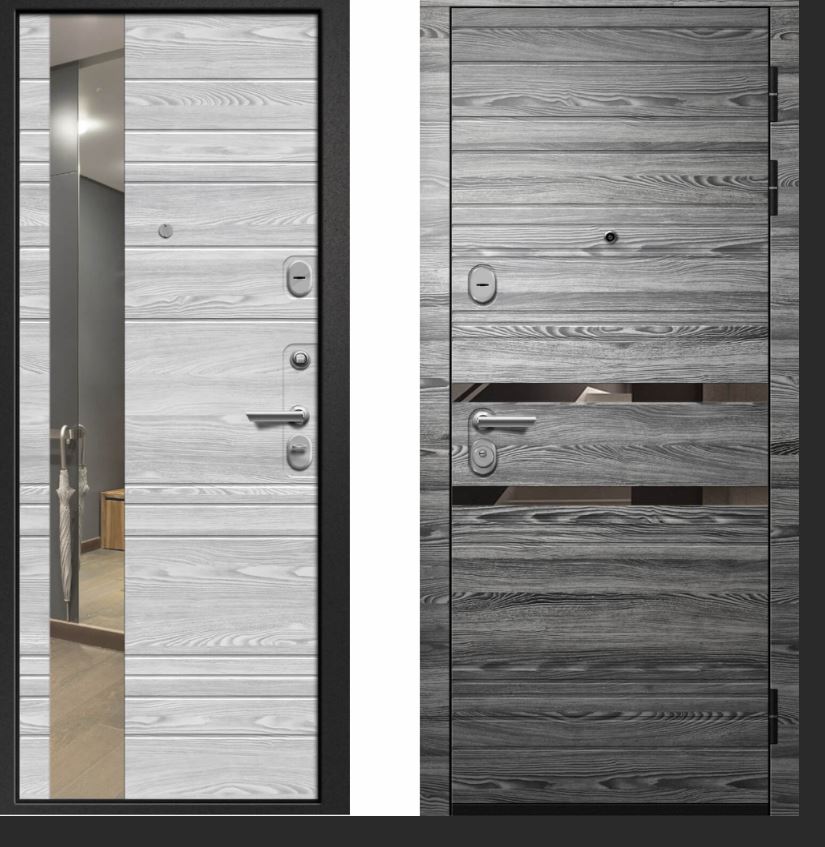 Внешняя отделка: Трехслойное полимерное покрытие + МДФ 10 мм(декор) Цвет: Вяз каньон вековой графит+молдинг (RAL7039) Внутренняя отделка: МДФ 10 мм с фрезерованным рисунком Цвет панели: Вяз каньон вековой айс и вставка «зеркало» Толщина стали:1,4 мм. Толщина полотна: 115 мм Толщина короба: 145 мм Наполнение: минеральна плита Уплотнение: тройной уплотнитель Размеры: 860*2050, 960*2050 Основной замок: BORDER 3B4-3/85Г (цилиндровый) Дополнительный замок: BORDER ЗВ 8-6/Б5Т (сувальдный) Ночная задвижка: есть Ручка раздельная, ключ вертушка, броненакладка, глазок, эксцентрик