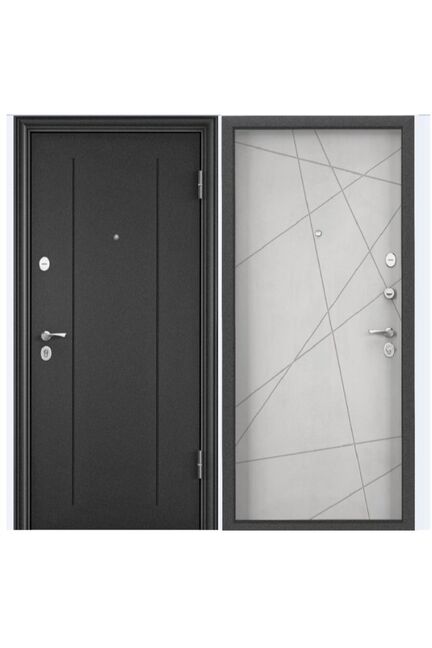 Надёжная металлическая дверь, идеально подходит для установки в квартиру или частный дом, обеспечит максимальную защиту и современный стиль. Снаружи — покрытие тёмно-серый букле графит RGSO, внутри — изысканный бетон известковый D6-26 с декоративным хромовым молдингом, что делает модель универсальным решением для разных интерьеров.