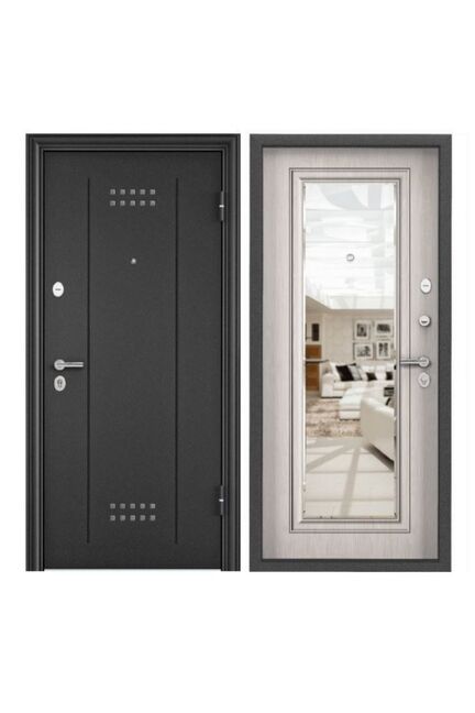 Прочная металлическая дверь с стильным покрытием тёмно-серый букле графит и внутренней отделкой лиственница белая — надёжное решение для квартиры, дома или офиса, сочетающее безопасность и современный дизайн.
