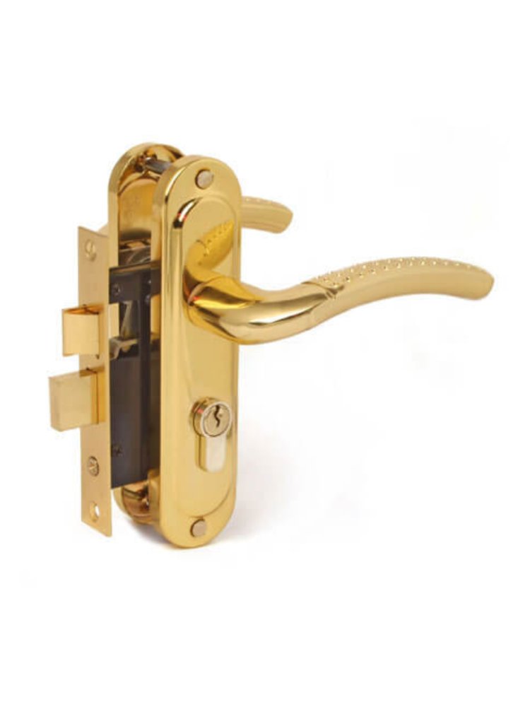 Врезной замок с золотым покрытием, межосевое расстояние 60 мм, подходит для любого типа дверей, надёжный корпус, простой монтаж.