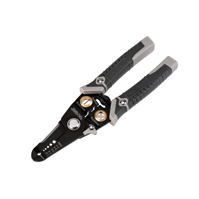 Многофункциональный инструмент 7 в 1 предназначен для выполнения различных работ с проводами и кабелями. Инструмент позволяет быстро и легко снять изоляцию с провода без повреждения медной жилы. Изготовлен из высококачественных материалов, что гарантирует долговечность и надежность в использовании. Эргономичные рукоятки обеспечивают надежный захват и снижают усталость даже при длительной работе. Пружина между ручками упрощает работу с инструментом и делает использование более эффективным и удобным. Для удобства хранения предусмотрен специальный фиксатор закрытого положения. Функции: 1. Тонкогубцы 2. Стриппер для снятия изоляции провода сечением от 1 до 3,2 мм² 3. Резак для зачистки изоляции 4. Разделитель жил 5. Инструмент для обжима клемм 6. Скрутка жил 7. Кабелерез Многофункциональный инструмент для быстрой зачистки и резки проводов 1–3,2 мм² с анатомическими рукоятками и долговечными лезвиями.