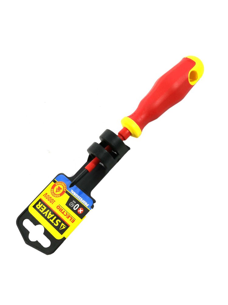 Используется при выполнении электромонтажных работ под напряжением до 1000В. Стержень произведен из хромованадиевой стали и покрыт специальным изоляционным материалом. Благодаря намагниченному оксидированному наконечнику, обеспечено удобство в работе. Изолированная эргономичная рукоятка обладает противоскользящим покрытием и отверстием для подвески. Изолированная отвертка PH0×60 мм, защита до 1000 В, магнитное жало и эргономика для безопасной и точной работы с электрооборудованием.
