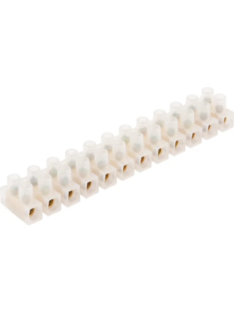 Надёжное и простое решение для подключения электрических проводов в домашних и промышленных условиях — винтовая клеммная колодка на 12 контактов обеспечивает быстрое и безопасное соединение проводников сечением от 4 до 12 мм и токовой нагрузкой до 16А. Изготовлена из устойчивого к механическим воздействиям и износу белого полиэтилена, подходит для широкого спектра работ — от разводки электрики в жилых помещениях до подключения в распределительных щитах и электрощитовых.