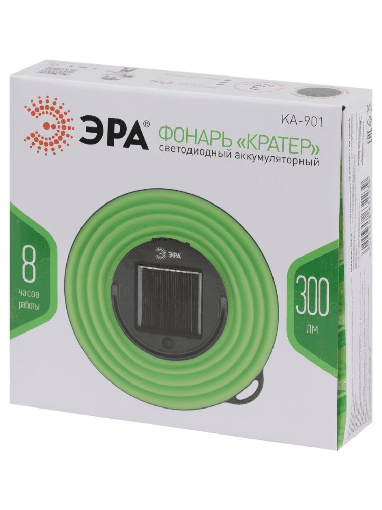 ЭРА KA-901 "Кратер" - кемпинговый светодиодный фонарь с двумя типами питания - встроенный аккумулятор и встроенная солнечная батарея. Для подзарядки фонаря можно использовать USB-кабель, поставляемый в комплекте, или естественную световую энергию. От одной полной подзарядки работает около 8 часов. Этот компактный походный фонарик необычен и своим дополнительным функционалом. Корпус-трансформер с высокой защитой от влаги (IP65) позволяет применять его в качестве небольшого стакана Складной фонарь 3Вт с аккумулятором и солнечной батареей, 3 режима, IP65 — для строительства, дачи, походов, ремонта и экстренных ситуаций.