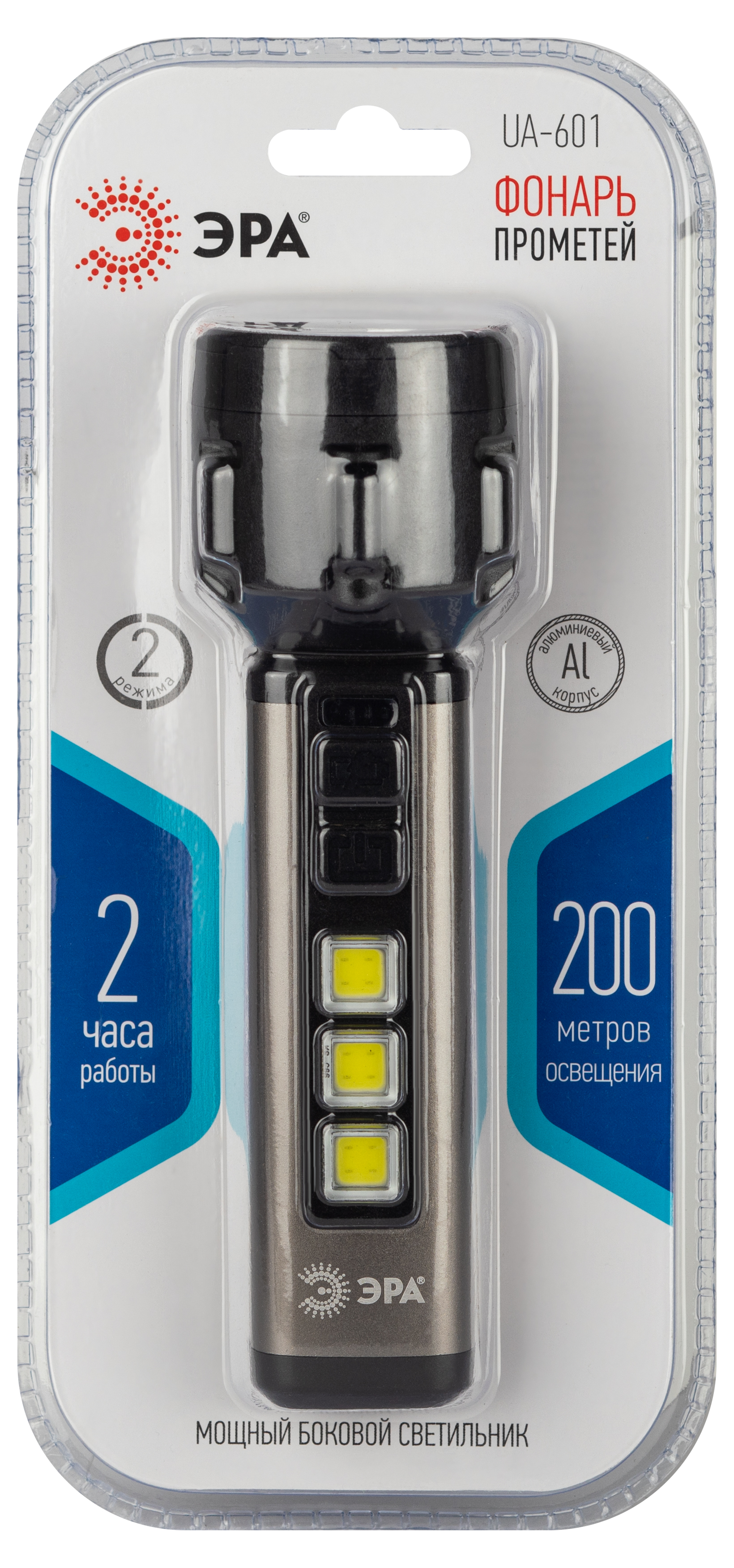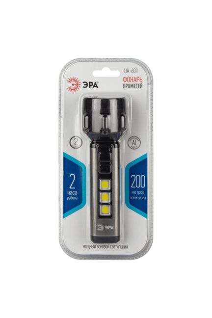 ЭРА UA-601 «Прометей» - аккумуляторный ручной фонарь с мощным 3-сегментным боковым светильником. Уникальный для российского рынка дизайн. Яркий головной луч (1 SMD-светодиод) дальностью до 200 метров помогает качественно освещать дорогу или подсвечивать конкретные предметы. Боковой светильник, состоящий из 3 компактных, но очень ярких COB-матриц с инновационными микросветодиодами, формирует широкое заливающее освещение. Ручка фонаря изготовлена из алюминия. Новый LED-фонарь имеет эргономичную конструкцию и комфортно лежит в руке. Кнопки включения прорезинены и приятны на ощупь. Ёмкий литиевый аккумулятор 800 мАч отлично держит заряд. После полной подзарядки фонарь светодиодный ЭРА «Прометей» непрерывно светит 2 часа. Есть индикатор заряда. Ручной фонарь отличается повышенным световым потоком – 420 Лм. Выпускается в презентабельной блистерной упаковке. Компактный фонарь с COB LED 5Вт и Li-аккумулятором, яркое освещение, прочный корпус, длительное время работы, зарядка от USB.