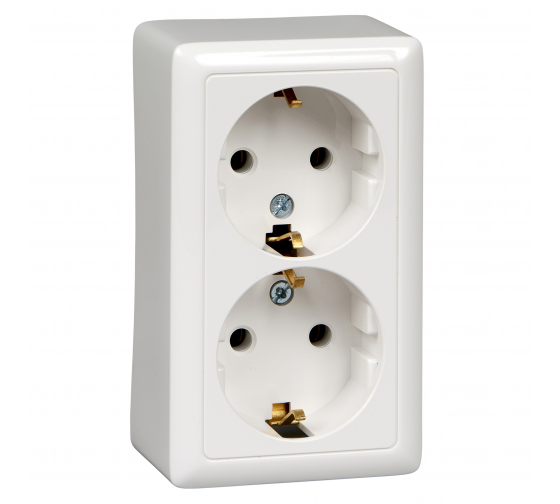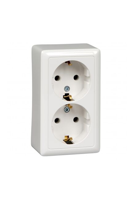 Две розетки с заземлением, корпус из прочного пластика, удобный наружный монтаж и надежная защита для подключения электрических приборов.