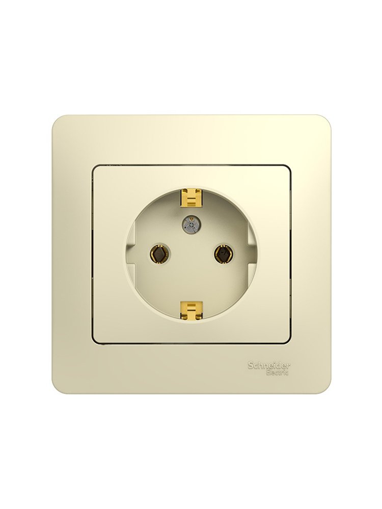 Бежевая розетка 16А с заземлением, устойчивый корпус, простой монтаж, подходит для бытовых приборов и инструментов, обеспечивает безопасность.