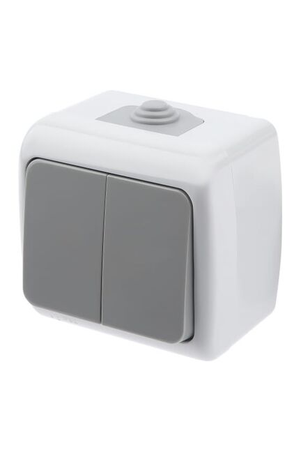 2-клавишный выключатель 10А, степень защиты IP54, устойчив к влаге и пыли, подходит для наружной установки в сложных условиях.