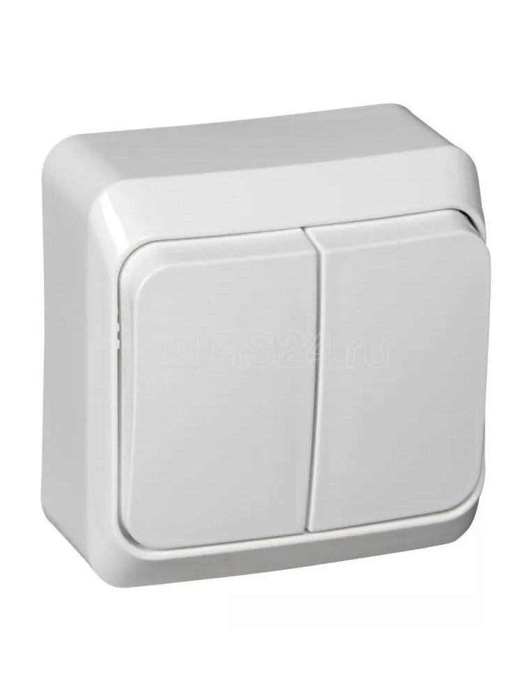 Двухклавишный выключатель, наружный монтаж, 10А, белый, устойчив к износу, легко монтируется, подходит для дома и офиса.