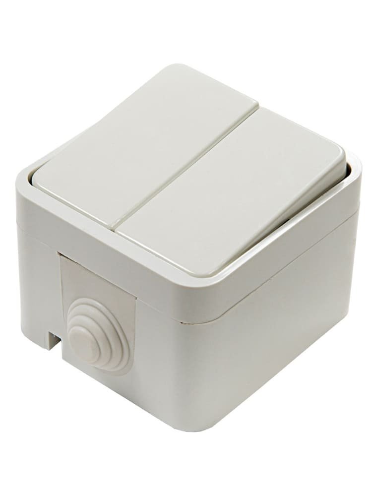 Влагозащищённый двухклавишный выключатель IP44 для наружного монтажа. Подходит для влажных помещений и улицы, удобен и надёжен.