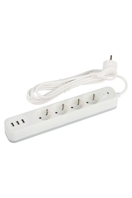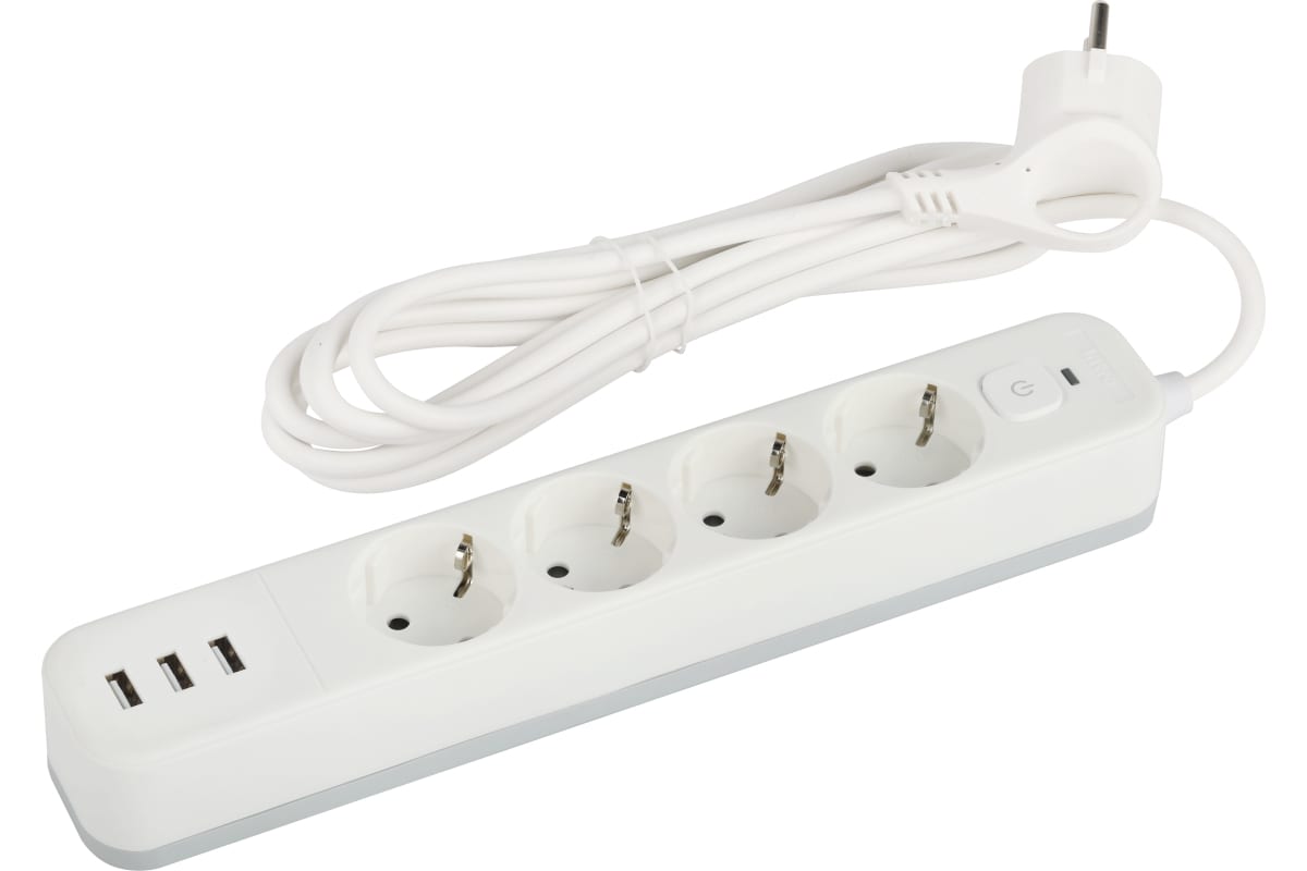 4 розетки с заземлением, 3 USB, кабель 3 метра, защита от перегрузок, максимум удобства для электроинструмента и зарядки устройств.