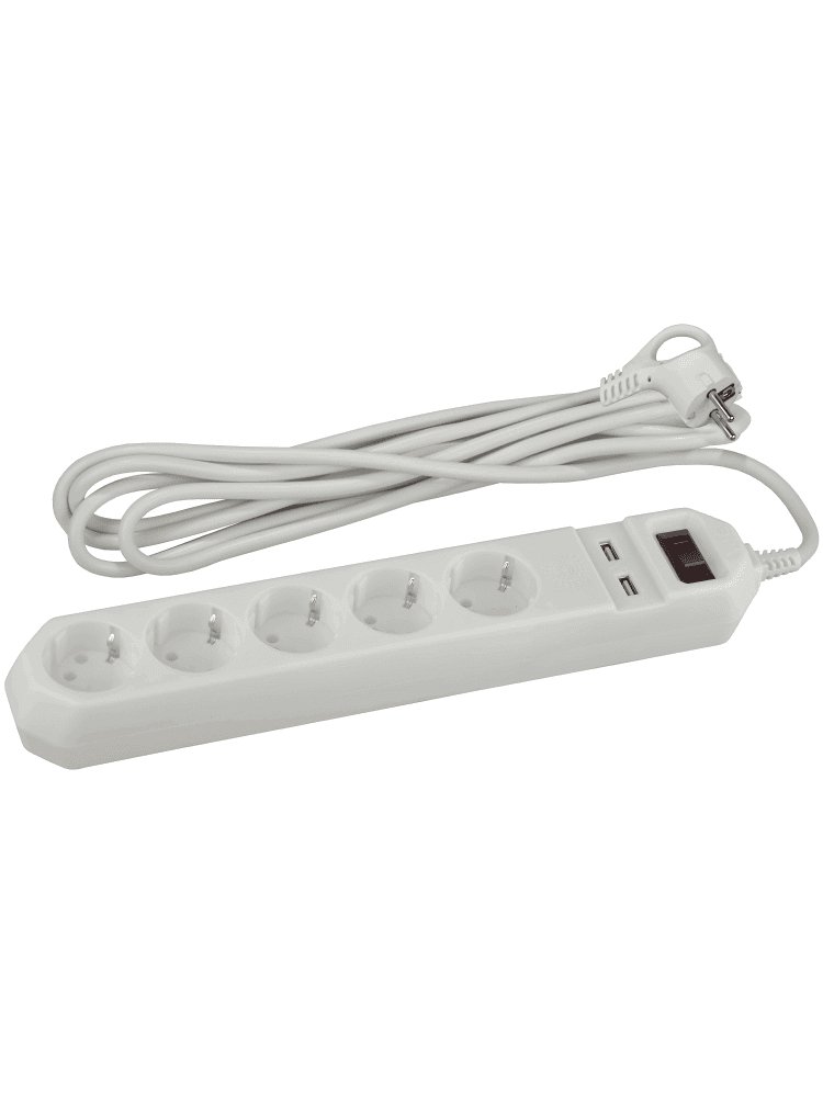 5 розеток с заземлением, 2 USB-порта, длина провода 1,5 м, выдерживает до 2200 Вт. Идеален для строительных работ и бытового использования.
