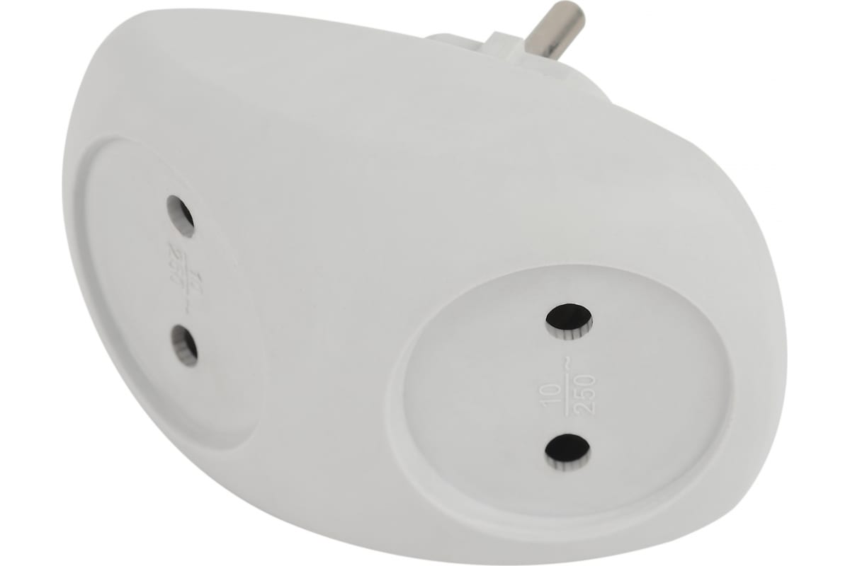 Разветвитель на 2 гнезда, 10А, без заземления, компактен, безопасен и подходит для большинства бытовых и строительных работ.