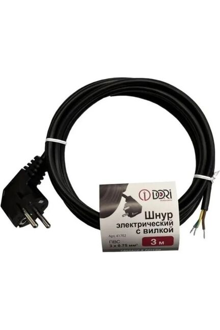 Трёхжильный гибкий шнур с вилкой, длина 3 м, сечение 0,75 мм², подходит для устройств с заземлением, надёжная изоляция, универсален в применении.