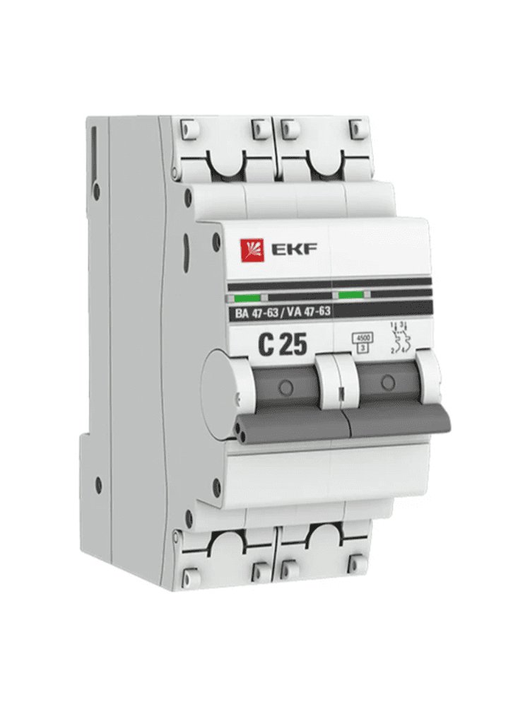Автомат 2P 25A (C) 4,5кА BA 47-63 EKF PROxima — надежный двухполюсный выключатель для защиты цепей от перегрузок и КЗ, простой монтаж на DIN-рейку.