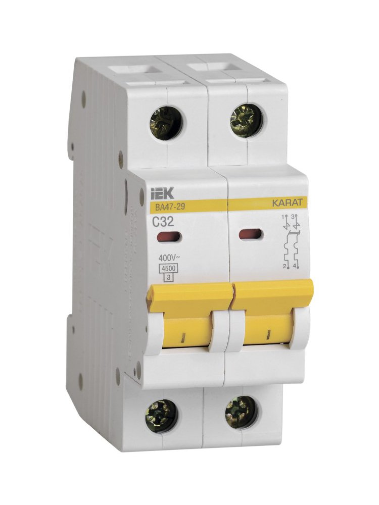 Двухполюсный, ток 32А, характеристика C, отключающая способность 4,5кА, для защиты от коротких замыканий и перегрузки, установка на DIN-рейку.