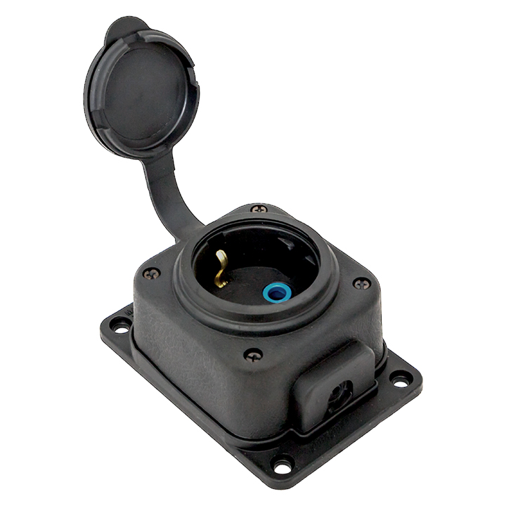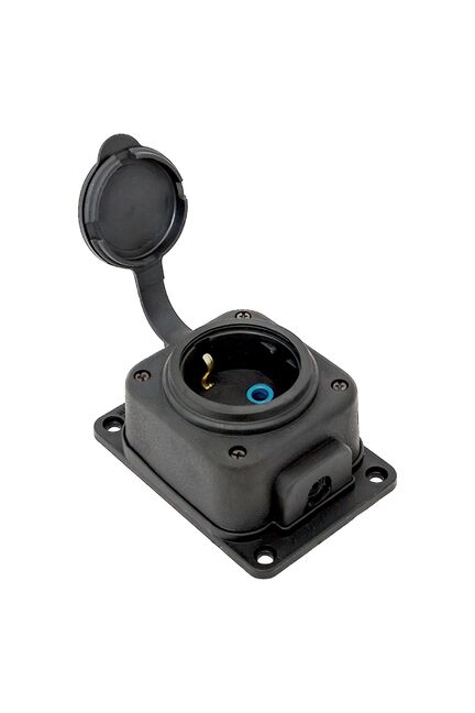 Влагозащищённая розетка 16А с заземлением и защитной заглушкой для безопасного подключения техники на улице и в сложных условиях.