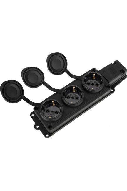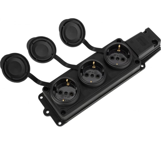Трехместная штепсельная розетка PROCONNECT влагозащищенная 2P+PE 230V, 16 А, IP44 каучук предназначена для использования в сложных эксплуатационных условиях и широко применяется в производстве, строительстве и машиностроении. Она легко монтируется, имеет высокую надежность и долгий срок службы. Ударопрочный разборный корпус выполнен из каучука - полимерный материал, сочетающий внешний вид, упругость и эластичность обычного каучука и эффективность обработки пластмасс. Тройная каучуковая розетка, 16А, IP44, с заглушками и заземлением — для безопасного подключения техники в условиях влаги и пыли.