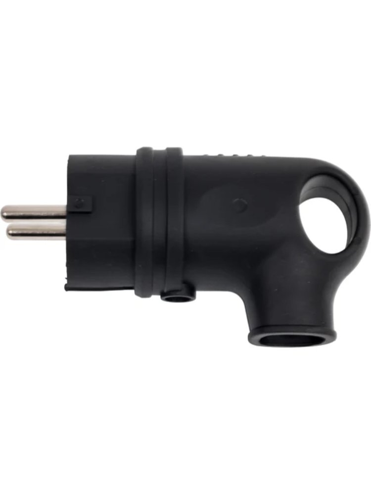 Угловая вилка 16А IP44, каучуковый корпус, заземление, устойчива к влаге и механическим воздействиям, идеальна для работ внутри и снаружи помещения.