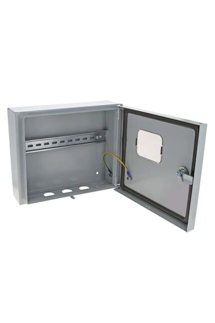 Металлический корпус 300×250×100 мм, IP54, защищает электрооборудование от пыли и влаги, подходит для скрытого и наружного монтажа.
