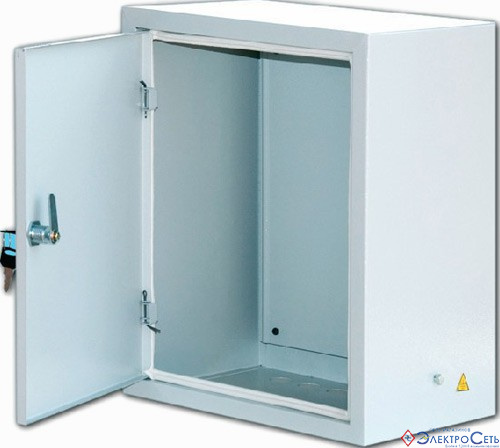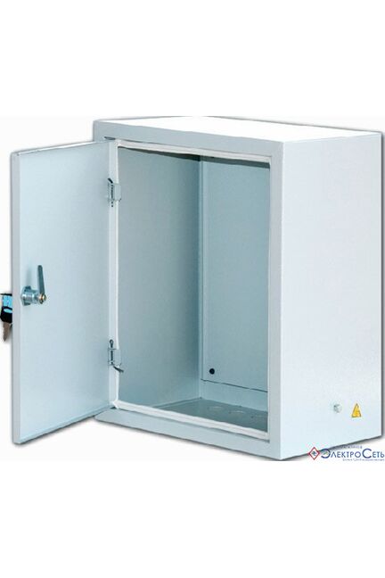 Компактный стальной щит IP54 для надёжной защиты электрооборудования от пыли и влаги, с монтажной панелью и удобным креплением.