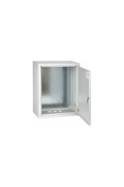Металлический щит 500×400×220 мм с монтажной панелью, IP55. Защита от пыли/влаги, прочность и безопасность для систем электроснабжения.
