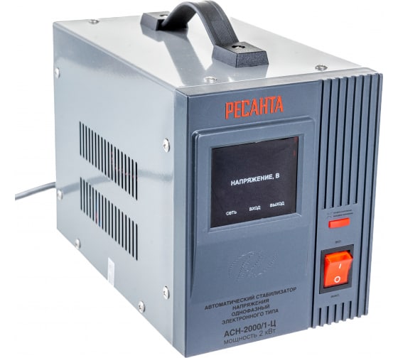 Стабилизатор напряжения однофазный Ресанта АСН 2000/1-Ц релейного типа предназначен для поддержания в электрической сети заданного напряжения. Аппарат защищен от высокого напряжения, перегрева и перегрузки. Отверстия, расположенные на корпусе аппарата, способствуют быстрому забору воздуха, необходимого для охлаждения. Предусмотрена функция регулируемой задержки подачи выходного напряжения. Поддерживает стабильное напряжение 140-260В, автоотключение, цифровая индикация, мощность 2000 ВА — надёжная защита техники.