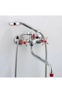 Гарантийный срок: 1 год на корпус и покрытие. Материал: Силумин Стильный двуручный смеситель с изливом 30 см, устойчивым покрытием красный/хром и надежным латунным корпусом для ванной комнаты.