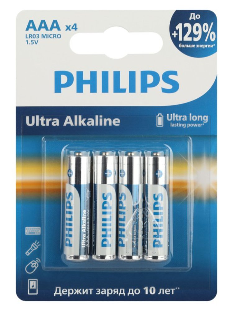 Батарейки Philips представляют собой набор из 4 алкалиновых батареек типа AA с напряжением 1,5V. Они идеально подходят для использования в энергоемких устройствах, таких как электронные игрушки и портативные аудиоплееры. Батарейки AAA Ultra Alkaline: высокое напряжение 1,5 В, защита от протечек, надежная работа инструментов и техники при ремонте и отделке.