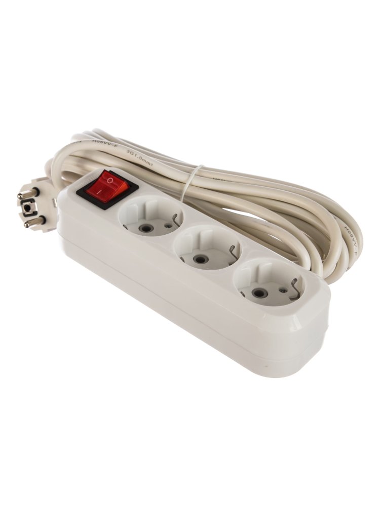 Номинальное напряжение: 250 В; Частота: 50 Гц; Номинальный ток: 16 А; Тип провода: ПВС 3x1,0мм2; Материал корпуса: АБС-пластик; Климатическое исполнение: УХЛ-3; Степень защиты от влаги и пыли: IP-20; Цвет: белый. Удлинитель 3 розетки, длина 5 м, заземление, выключатель, нагрузка до 16 А — удобно для инструментов и бытовых устройств на стройке и в мастерской.