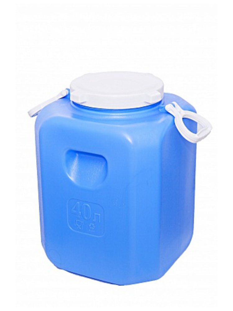 Пластиковая фляга на 40 л для пищевой воды, устойчива к ударам и УФ, герметична, с ручками, подходит для стройки, дачи и хранения жидкостей.