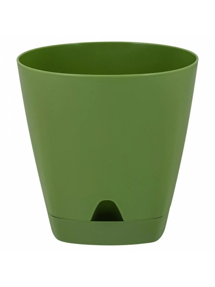 Горшок 2,5 л с прикорневым поливом сохраняет влагу у корней, облегчает уход и украшает интерьер благодаря стильному оливковому цвету.